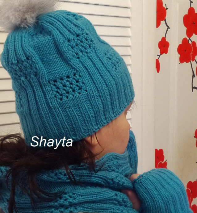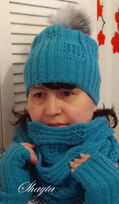 Здравствуйте,мастерицы! Комплект “Дворики” выполнен из пряжи Ализе Ланаголд 800 (в 100г -800м), в 3 нити. Спицы №3. Митенки выполнены в 2 нити-резинкой 2х2, по краю обвязаны крючком арочками из 3 петель.На шапку набирала 120 петель, 3 ряда полой резинки, затем перевела на резинку 2х2, связала 6 см. Высота шапки 25 см, сверху меховой помпон. Снуд связан в 3 нити, в два оборота, длиной-130см, шириной-21см.Этот комплект связан не для себя(не идёт мне по возрасту...),он связан для крестницы 12-ти лет. Всем вдохновения и удач!