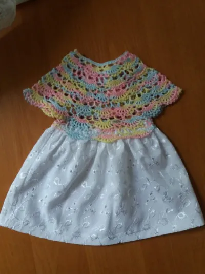 На этот раз - совмещение вязания и шитья.Получилось вот такое платишко. Кокетка связана из YarnArt Violet крючком (номер не известен). Юбочка - из остатков батиста, найденных в "закромах".