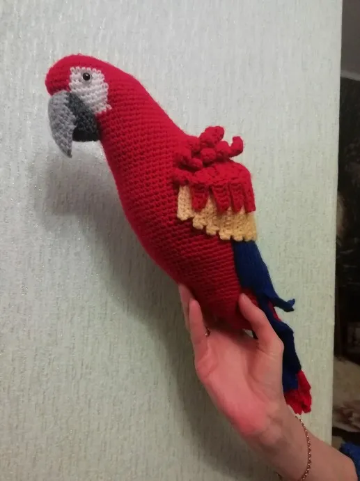 Мне интересно вязать необычные игрушки. И вот на просторах интернета нашла схему попугая. Только лапки связать не успела, он улетел на другое место жительства)))