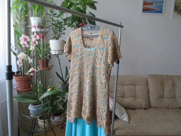Связала кофточку. Пряжа оставалась и захотелось довязать до платья. Но... И так часто бывает, не хватило одного моточка пряжи. И докупить не получилось. Поэтому получилась туника. Пряжа прекрасная. Семеновская хлопок с вискозой, Она мне очень нравится.