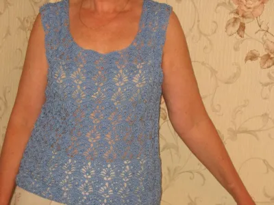 И правда нежный, но я бы сделала окантовку проймы, ворота и низа либо кружевом либо столбиками без накида и тогда был бы законченный вид.