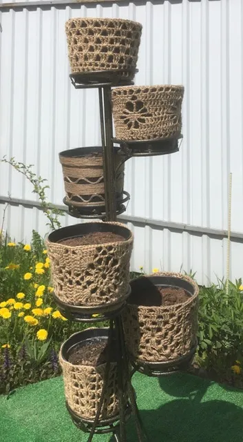 Кашпо связаны из джутового шпагата.Никак не высажу в них цветы. Погода не дает.