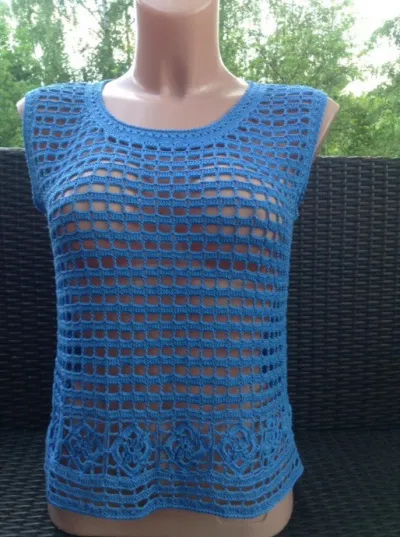 Продолжаю пристраивать остаточки пряжи.Вчера закончила вязать топик на который ушло 180г.Связан он сетчатым узором с полосой из мотивов.Пряжа "Лилия"Семеновской фабрики,392м в 100г.100% мерс.хлопок.Цвет - гиацинт (955).Крючок 1,5.Размер 44-46.