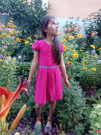 Платье-халатик для девочки ярко розового цвета выполнено из очень мягкого хлопка, приятного на ощупь, вязка эластичная с рисунком, окраска прочная. Рукав "фонарик", спереди застегивается на маленькие кнопочки, что очень удобно. В таком нарядном платье не будет жарко или холодно. Смотрится очень привлекательно. Ребёнок будет чувствовать себя комфортно.
