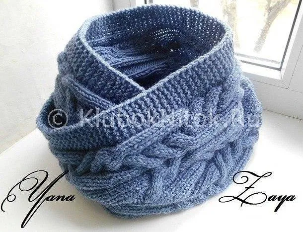 Вяжем спицами красивый снуд в синем цвете косами. Называется — «Переплетения». Пряжа Лана голд от Alize, спицы № 4. Ушло примерно 3 мотка. Цвет номером 684. Размер данного снуда 30 см на 130 см. Длину конечно делаем по желанию. В один оборот или как здесь в два. Моделька очень интересная. По этому узору можно связать шапку и украсить ее помпоном. Можно поменять расцветку. Схема прилагается.