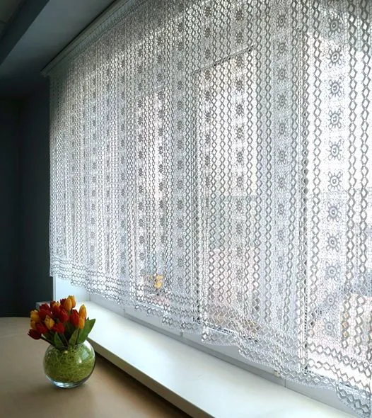 Ширина 107 дюйма, длина 44 дюйма. На фотографиях вы можете увидеть шторку с 100 % хлопковой пряжи (25 г / 230 м) крючок #0, 75.