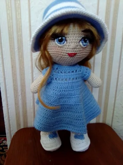 Добрый день, уважаемые рукодельницы! Я опять как-то ушла в тень. Но я не бездельничала! Вот такая голубоглазка получилась. Глазки вышивала, использовала накладные ресницы 5D. Волосы: искусственный парик для кукол.Рост 35 см, ручки-ножки подвижны, может самостоятельно стоять, сидит, одежда снимается. Одна моя знакомая написала, что кукла очень похожа на нее в детстве. Так появилось имя Алла!