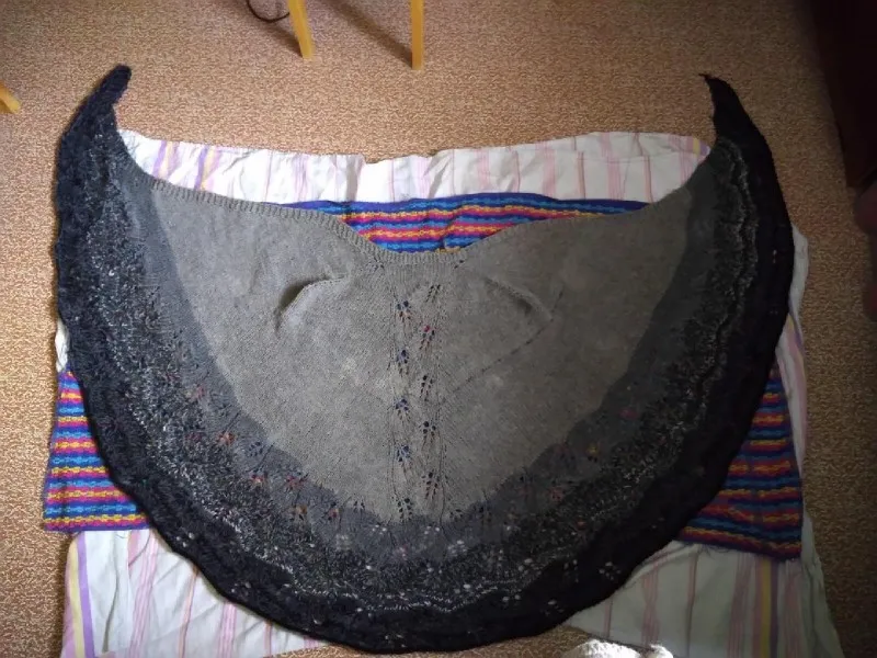 1. датских шалей 2 вида, кружевные- парадные ( накидки), и теплые рабочие (серповидные края, завязываются. я начала вязать рабочую шаль по МК накидки. В результате придется после сушки шали довязать углы шали ( так тоже делается). Хотя они бы уже завязывались, будь моя талия постройнее(((