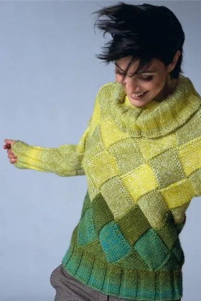 Продолжить вязать узором таким образом, в изн. р. последняя петля треугольника вместе со следующей петлёй квадрата провязывается изн., в лиц. р. последние 2 п. вместе лиц, В последнем изн, р. 2 п. вместе изн„ затем набрать и провязать 11 п. вдоль бокового края следующего квадрата = 12 п. Повторять от *. После 2-го завершающего треугольника связать ещё 3 квадрата, затем снять все петли на вспом. спицу. Для выреза горловины переда связать 2 основных треугольника, разделив работу. Вязать перед до конца симметрично. Нитью жёлтого цвета набрать вдоль нижнего края рукавов по 50 п., слегка растягивая в ширину и вязать следующим образом: в 1-м изн, р, вязать кром., затем чередовать 5 изн., 3 лиц., заканчивая 1 кром. Через 20 см закрыть все петли. Набрать нитью зелёного цвета вдоль крёв переда и спинки по 80 п. и вязать узором резинкой, начиная 1-й изн. р. с кром., 2 лиц., затем чередовать 5 изн., 3 лиц,, заканчивая симметрично. Через 9 см закрыть все петли. Выполнить боковые швы и швы рукавов. Для воротника нитью жёлтого цвета на круговые спицы набрать 96 п. и вязать резинкой круговыми рядами. Через 12 см снять последнюю лиц. п, каждой 2-й лиц, п. резинки как изн., 1 изн. и протянуть провязанную петлю через снятую = 90 п. Через 14 см выполнить убавления таким же образом на оставшихся петлях резинки = 84 п. Через 18 см закрыть все петли. Пришить завершающий край к вырезу горловины, слегка растягивая в ширину.