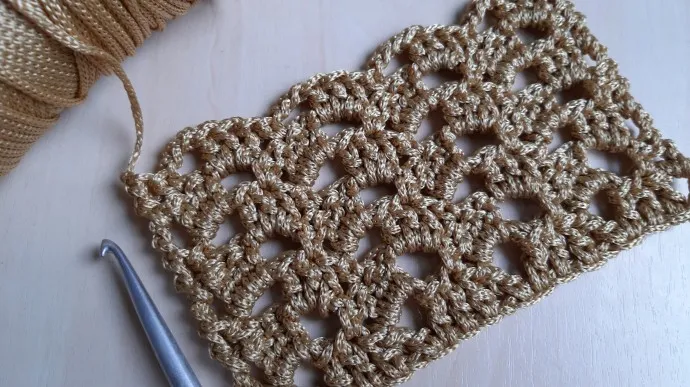Простой ажурный узор крючком поворотными рядами, хорошо смотрится и легко вяжется. Справится даже новичок.