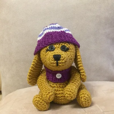 Щенок маленький, всего 14 см ростиком, лапки двигаются, шапочка снимается, глазки пуговки,носик вышит, связан из хлопка(ирис). Цена 650 руб.