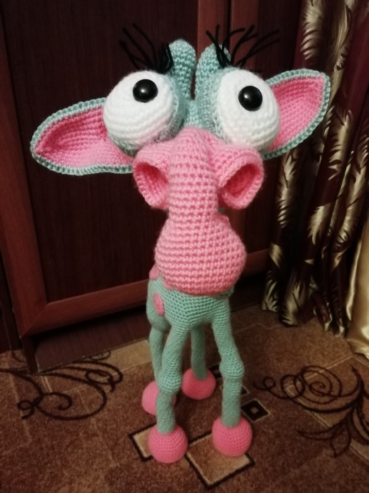 Жирафик связан по схеме, найденной в интернете. Высота с выпрямленной шеей 70 см. Стоит на каркасной основе, в копытах добавлен утяжелитель для устойчивости. Получился довольно необычный жираф, весёленький такой.
