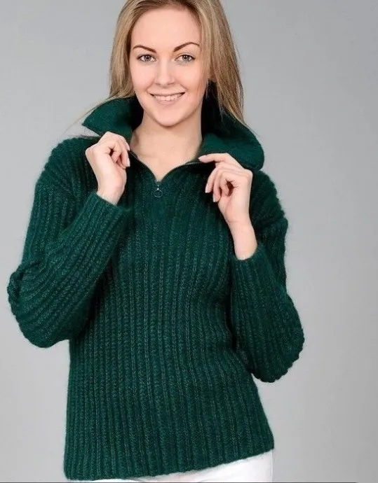 400 г пряжи зеленого цвета (80 % мохер, 20% акрил, 500 м/100 г), спицы № 3, молния длиной 30 см.