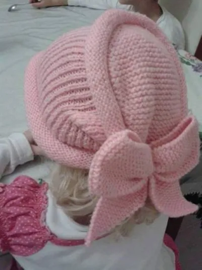 Заложить 3-ю деталь бантом и пришить её к заднему шву шапки.
