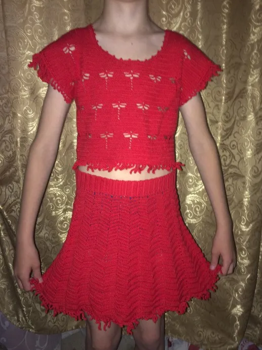 Вот такой комплект связался старшей внучке на День Рождения. Топик «Стрекоза» связался быстро, а вот юбочка перевязывалась раз восемь, не нравилось как лежит полотно юбки. В итоге связала самый простой зигзаг. На топике и юбочке обвязку сделала бахромой, только горловину топика обвязала просто столбиками без накида и «пико». Вязала нитками COCO Vita color 3856, 50г/240м, крючок 1,4мм. Осталось сшить подклад и отправить в Кемерово.