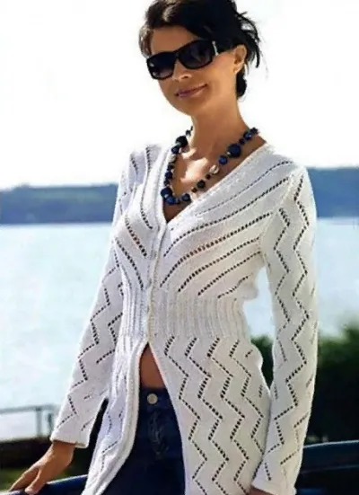 Перевести петли на спицы № 5,5 и продолжить вязание зигзагообразным узором. Для приталивания, в каждом 8-м ряду, 6 раз убавить по 1 петле с обеих сторон вязания.