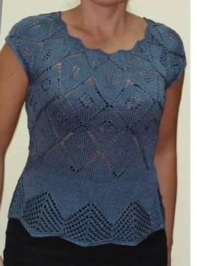 Т.к. спицы на леске, можно было все примерять в процессе вязания. Нитка была тонкая, поэтому рисунок ромбов повторила и далее вязала лицевой гладью перед каймой, сколько понравилось (пока не надоело, т.е. в 71-м ряду не стала делать ажур между треугольниками, а повязала гладью и только когда ширина гладьевой полосы меня устроила, стала провязывать среднюю часть рисунка, пока не получилась кайма, как на схеме. Можно было и кайму увеличить (даже не помню, делала я это или нет, по-моему, пару-тройку рядов добавила) — все зависит от желания и пропорций. Т.к. у меня тонкая нить, мне пришлось вязать гораздо больше рядов, чем указано в схеме, иначе мой топик закончился бы сразу под грудью Я так понимаю, что у вас тоже нитки тонкие, значит, придется также добавлять ряды и,
