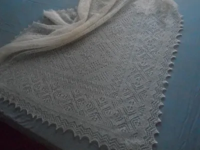 . Ажурный платок паутинка из белого ангорского козьего пуха с добавлением шелковой нити, пух спряден отдельно. Полностью ручная работа, 140 х 140 см., вес 160 гр. Продана.