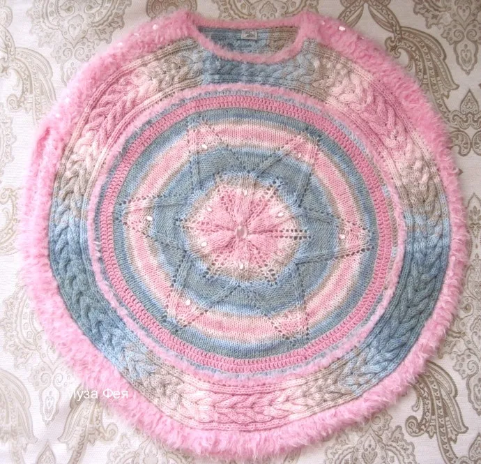 Это пончо мне очень понравилось оригинальностью. Пряжа Суперлана секционная и Лебяжий пух. Советую, если нужно, скопировать описание сразу, пока есть, так как Бурда и Верена изымают свои бесплатные описания.