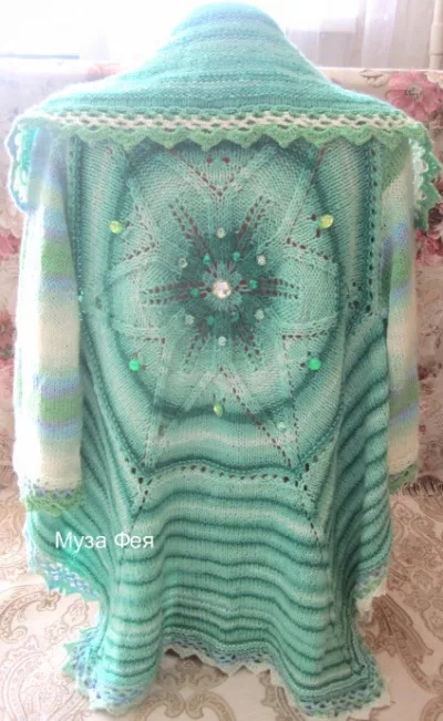 Начинаем по схеме, можно на 5 спицах, я вязала на двух с леской. Первые ряды (6-8см) туда-обратно, потом - по кругу. Когда модуль по схеме закончится, продолжайте вязать лицевой вязкой до ширины вашего размера, затем закройте петли двух клиньев (через один) и снова наберите закрытые петли. Это будут проймы для рукавов.