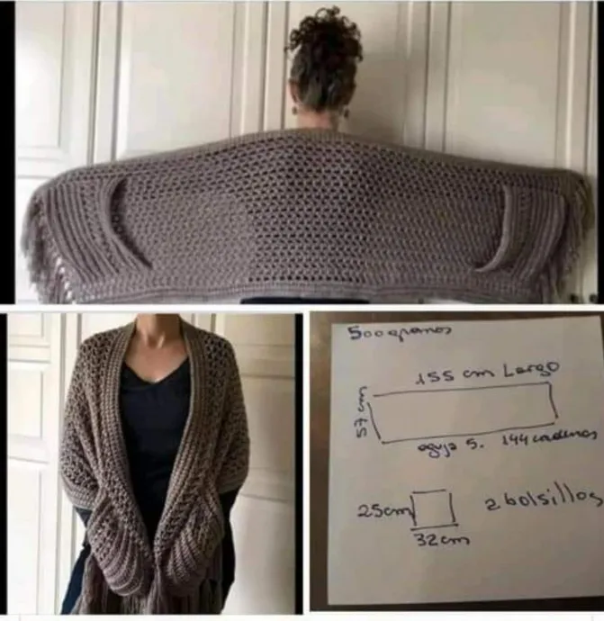 Из рисунка я лично поняла: 500 граммов ниток (каких — тут не знаю, наверное толстенькая полушерсть подойдёт. Размер шарфика 57 на 155 см, кармашки 25 на 32 см. 5 и 144 — тут мне кажется это крючок №5, возможно 144 столбика с накидом. Но это чистое предположение.