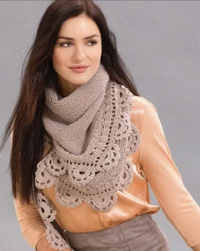 Сначала вяжем крючком кайму, затем платочной вязкой спицами выполняем весь платок.