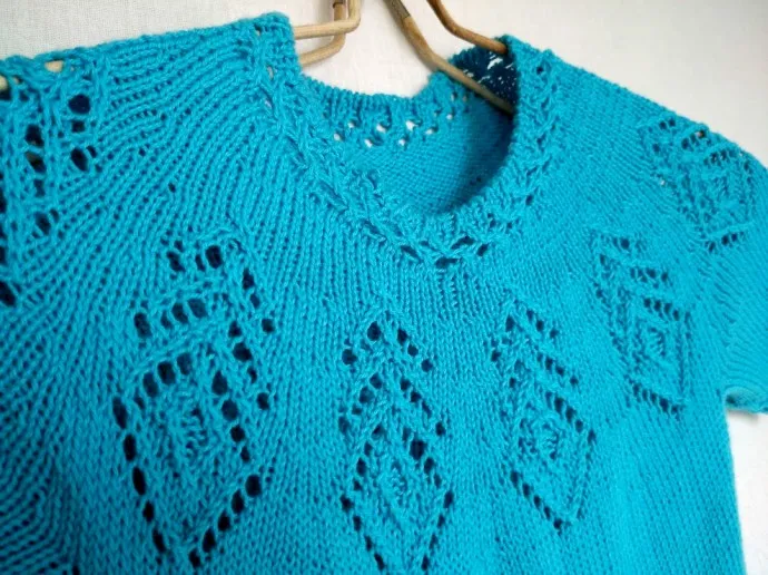 Поскольку платье летнее, то рукав короткий и закончила я его, как начинала вязать ворот, закрыв петли иголкой