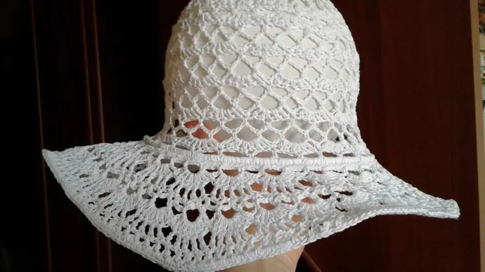 От жаркого солнца может спасти только шляпа.Шляпа была связана из остатков хлопчатобумажной пряжи Пехорка белого цвета,крючком №3. Рисунок ракушка и воздушные петли.Для поддержания формы я использовала регилин. Размер № 55.