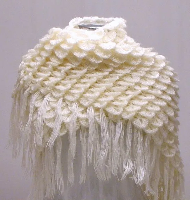 Переворачиваем работу. Вот тут очень внимательно! Продолжаем ещё 6 столбиков с накидом по следующему столбику с накидом предыдущего ряда, вывернув работу на себя. Полустолбик между двумя столбиками с накидом предыдущего ряда. 6 столбиков с накидом по следующему столбику, вывернув работу и ещё 6 по следующему – этот момент самый лёгкий, вяжется просто по изнанке, как лежит полотно. Если поняли весь предыдущий алгоритм, то повторяем его в каждом ряду, прибавляя по одной ракушке по рисунку. При желании такой приём будет хорошо смотреться при вязке рюш, воланов. На худеньких фигурах неплохо будет смотреться и как самостоятельное изделие.