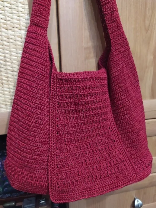 Сумка связана из хлопка, цвет темно-малиновый,можно носить на плече и за ручку