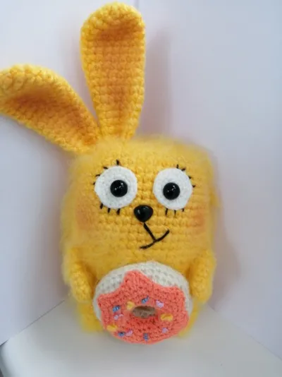 Ещё вот такой озорной зай получился, любитель пончиков! Нитки акрил, которые можно было начесать липучкой. Связался, потому что просто понравился, на будущий подарок кому-то..