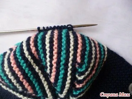 Первую петлю снимаем как кромочную и вяжем до конца. Получается, что мы каждым цветом провязываем 2 ряда-лицевой и изнаночный. Затем вяжем основным цветом, не довязываем уже 3 петли и опять вязание ем на изнанку. Добавляем нить еще одного цвета