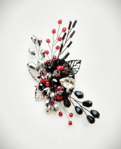 В работе использованы красивые сверкающие гранёные стеклянные бусины разных форм и размеров, чёрного,серебристого и красного цвета,а также стразы,чешский бисер и фурнитура под серебро. Изнанка аккуратно закрыта эко-кожей.