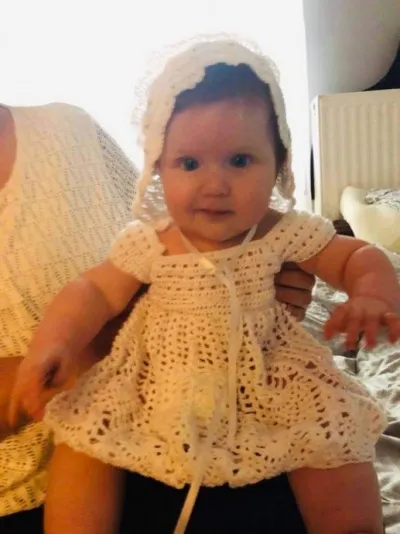Это платье крючкои я сделала для дочьки моей подруги. Узор - ананасы, шапочка - боннет.