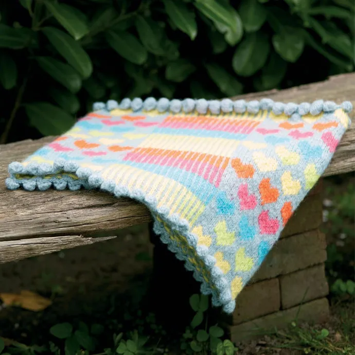 * 1 лиц. отделочной нитью, 1 лиц. основной нитью *, в ширину выполнять по 20 полос, заканчивать 1 лиц. отделочной нитью. На оставшихся петлях узор вязать по схеме, используя те же цвета нитей в качестве основной и отделочной, что и в узоре из полос. Вязать вертикальные полоски на 21 п., на остальных петлях = 132 п. (11 раппортов) — узор по схеме. Цвет сердечек менять в следующей последовательности: * желтый, светло-зеленый, бирюзовый, розовый, оранжевый*, от * до * выполнить всего 2 раза, закончить желтым цветом. Шарф-воротник с отделкой «шишечками»