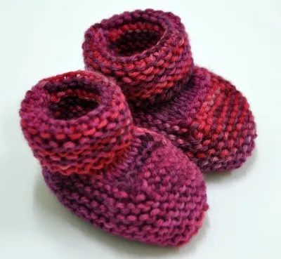 Эти пинетки вяжутся одной деталью на двух спицах от подошвы вверх, для завершения работы сшивается шов на подошве и заднике. Платочная вязка позволяет связать их очень быстро даже новичкам, т.к. в изделии в основном используются лицевые петли.