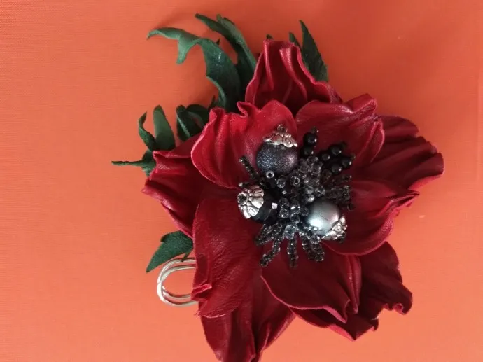 Брошь натуральная кожа Мак красный