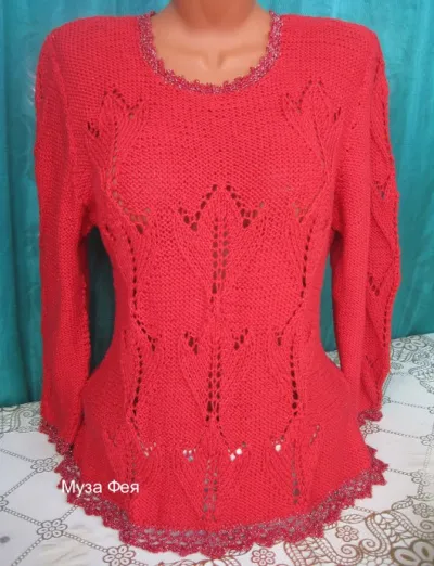 Несложный узор "тюльпан" вязать легко и приятно. Обвязка выреза, рукавов и низа - тонкой пряжей с люрексом - крючком.