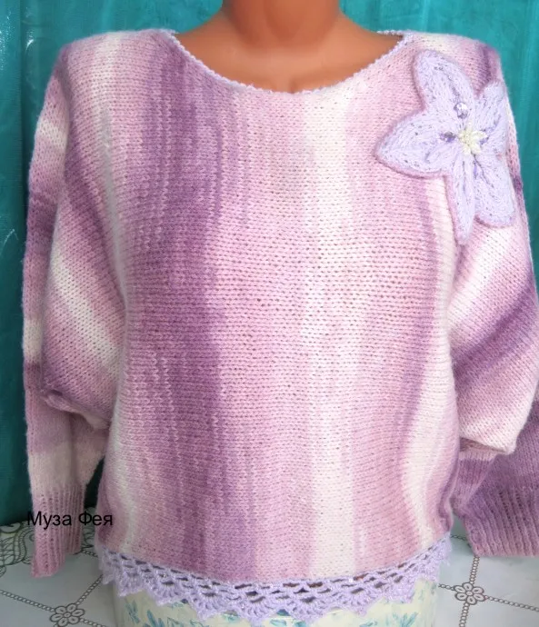 Придумала и связала пуловер фасоном "летучая мышь" на спицах из п/ш секционной пряжи средней толщины. Отделка - крючком. Все изделие - одна деталь, иначе полосы будут некрасиво "резаться" и не совпадать. Если вязать не из секционки, можно сделать из двух деталей, со швами на плечах. Силуэт просторный, в талии +10-20см в ширину. Размер - 44-50. Руки у меня не длинные, редактируйте на свои параметры.
