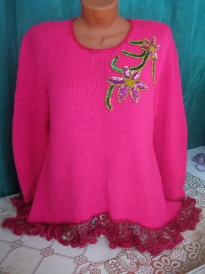 Пуловер связан из п/ш пряжи Аделия. Дугообразный низ взят мной из модели туники в интернете. Я заменила волан оборкой из пряжи Дантела и добавила рукава. Возможно, позже свяжу что-то с воланом, как в источнике, но пока упростила процесс.