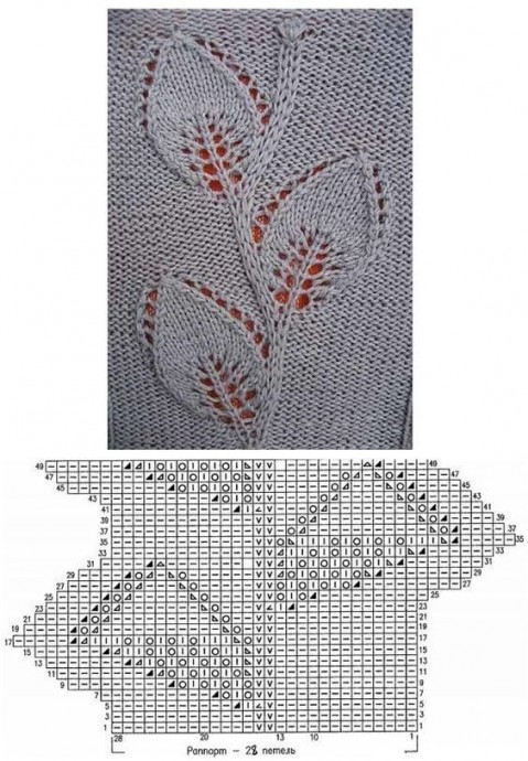 Показываю пуловер с листьями на ветках, но листики на этом узоре не параллельны, а чередуются на ветке. Оба узора красивы, но этот показался мне немного легче в вязании.