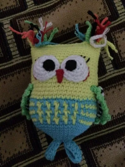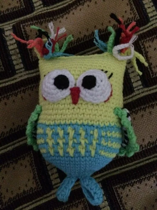 Вот такая Совунья связалась в подарок. Это игрушка-погремушка. Связана из ниток ЯнАрт джинс, крючок 1,6. Внутри синтепух и яйцо от Киндерсюрприза. В яйце делала отверстия иголкой из яйца, чтобы после стирки вода быстрее вытекала и не тухла. В яйцо положила бисеринки, они не так громко шумят при ударе. До этого вязала сову-погремушку и сделала ножки из бусинок, дочка попросила бусинки убрать. Поэтому сделала просто петельки вместо ног, всем погремушка понравилась. Крылышки на последнем ряду сделала «пико», так интересней получилось. Спасибо за просмотр! Всем ровных петелек!