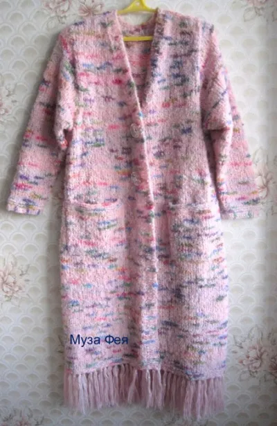 Низ пальто отделан бахромой из пряжи с пайетками. Вновь модная сейчас бахрома и буклированная пряжа делает простое пальто довольно интересным. Их буклированной пряжи бахрому делать не рекомендуется, так как кудрявая пряжа будет распускаться.