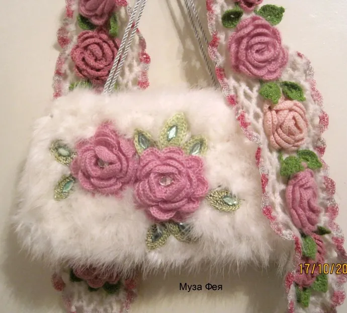 Шарфик и сумка связаны крючком. Шарфик - из разных видов пряжи: мохер, ангора, вискоза. Сумочка - из гагачьего пуха + искусственный мех. Ручки сделаны из серебристого шнура.