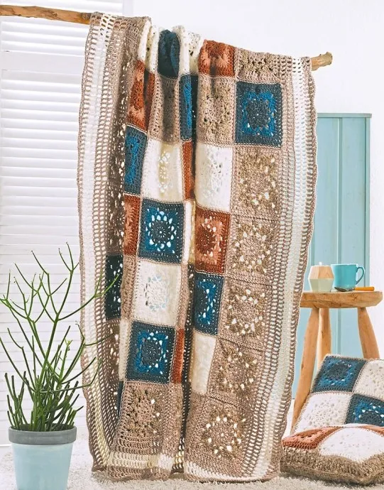 Разноцветные квадратные мотивы из пряжи разной фактуры объединяются в этом несложном симпатичном покрывале в одно целое.