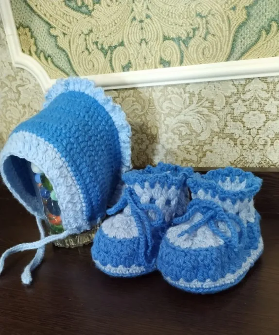 Шапочка и пинеточки связаны по заказу для малыша.Связаны из акриловой пряжи крючком №3 столбиками с одним накидом и пышными столбиками..В работе использованы два цвета