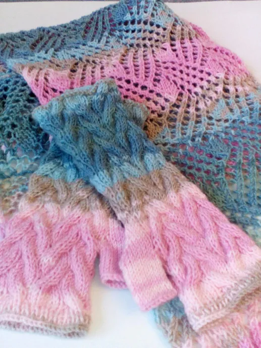 А это яркий , нежный комплект на не очень холодную погоду . Шарфик и митенки . Связаны из полушерстяной пряжи Ализе .