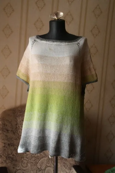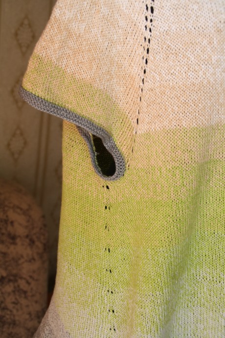 Вязала обычным регланом сверху, росток азиатский. Поскольку вещичка летняя - регланные линии с дырочками, также как и прибавки по условным боковым линиям для А силуэта сделаны тоже с дырочками, чтобы поддержать реглан. Ширина у подрезов - 54 см, в самом низу 74, прибавки делала с двух сторон от условных боковых линий в каждом 10-м ряду, всего прибавила 40 петель. Высота от плеча до низа 57 см. Ещё с одной стороны начала внизу делать "дорожку" из дырочек, но поздно спохватилась, нужно было пораньше начинать, было бы интереснее.