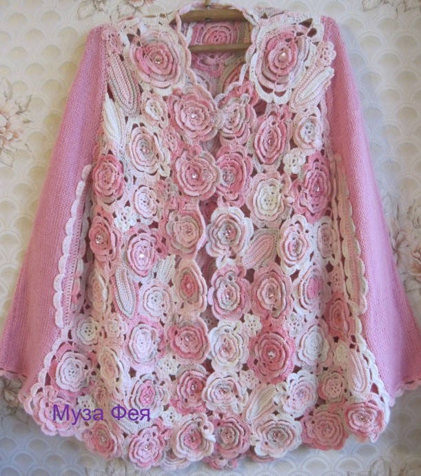 Моя авторская модель. Розы связаны из секционной турецкой пряжи Бэби файн (40%шерсти, 40 акрила, 20% бамбука), боковые детали - пряжа Суперлана классик розового цвета (25%шерсти, 75 акрила).