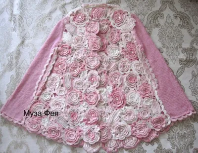 Крючком обвязать кейп фестонами по краям цветочных деталей, по низу боковых и прорезям. Застежка у меня - на две пуговицы в виде прозрачных роз.
